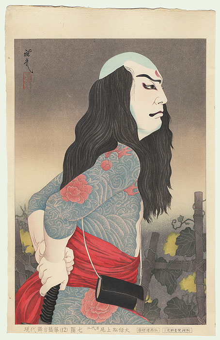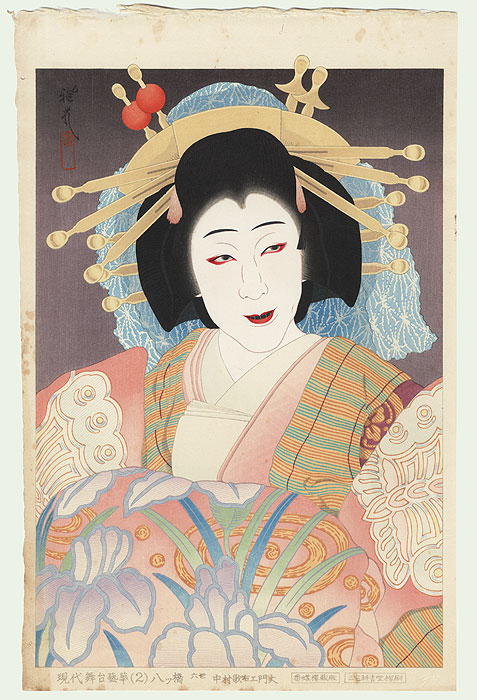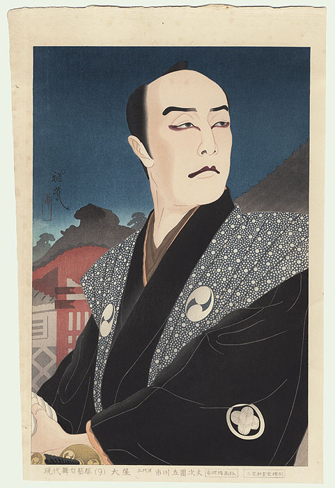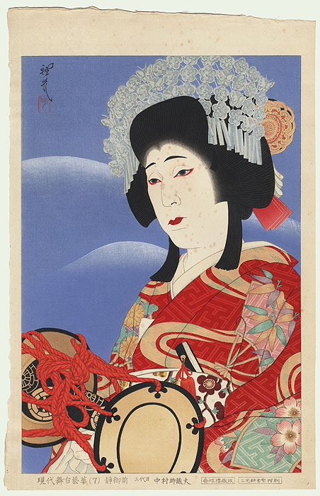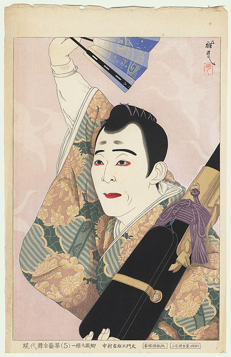 A leading kabuki artist of the later shin hanga period, Ota Masamitsu is best known for his two, 12 print portrait series, “Figures of the Showa Stage” and “Leading Figures of the Modern Stage in their Most Famous Roles,” published by Banchoro during the 1950s. In Ota’s works, we see the evolution of the shin hanga actor print towards more realistic portraiture. His designs incorporate Western style shading and perspective to create a much more three-dimensional image, along with beautifully precise line work and saturated color. Ota Masamitsu’s kabuki portraits are comparable to those of the better known Natori Shunsen, but Ota’s work remains little known and his woodblocks are rarely seen in the market. His powerful and expressive portraits capture the individual personality of the performer, and are a great choice for a kabuki enthusiast or shin hanga collector.
