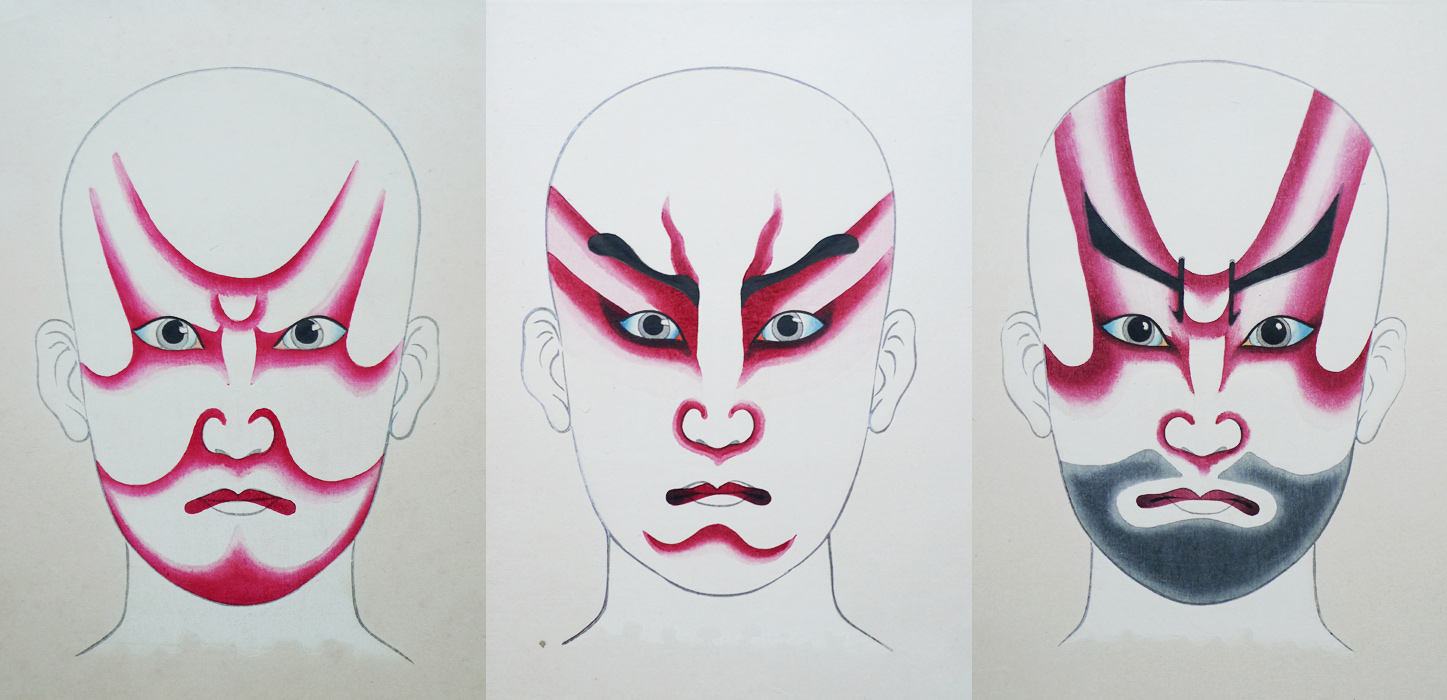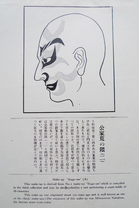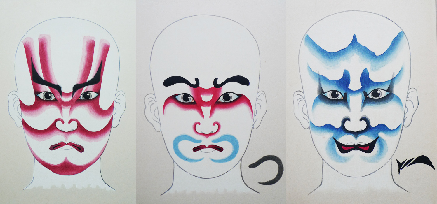 Kabuki Kumadori Prints – Terrific woodblock prints from a Taisho era series by shin hanga artist Ota Masamitsu depicting kumadori, a distinctive type of kabuki makeup used for aragoto characters. Aragoto refers to an exaggerated style of acting used to depict heroic warriors, demons, or fierce gods. The bombastic style encompasses all elements of the role, including hair, makeup, dialogue, and costume. These striking designs depict bold and colorful makeup, often giving the characters a frightening or otherworldly appearance. An attached tissue paper overleaf provides the name of the makeup and a description of the character in both Japanese and English, along with a profile view of the made-up face. Some are noted as antique or earlier style makeups no longer in use. A fantastic choice for a kabuki enthusiast or historian of theater.