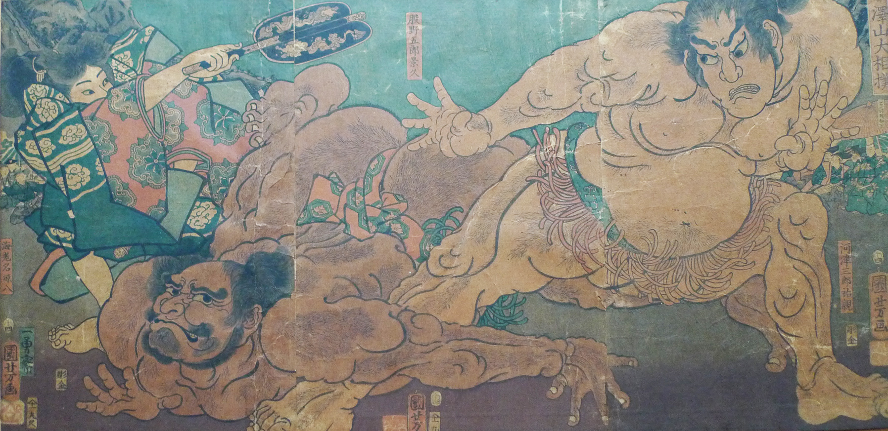 The most famous sumo wrestling match between Kawazo Saburō Sukeyasu (right) and Matano Gorō Kagehisa refereed by Ebina Genpachi at Akazawayama Mountain in 1176. In the background can be seen the first Kamakura shogun Minamoto no Yoritomo and his entourage. The match gave rise to a new maneuver called the “Kawazu hold.”