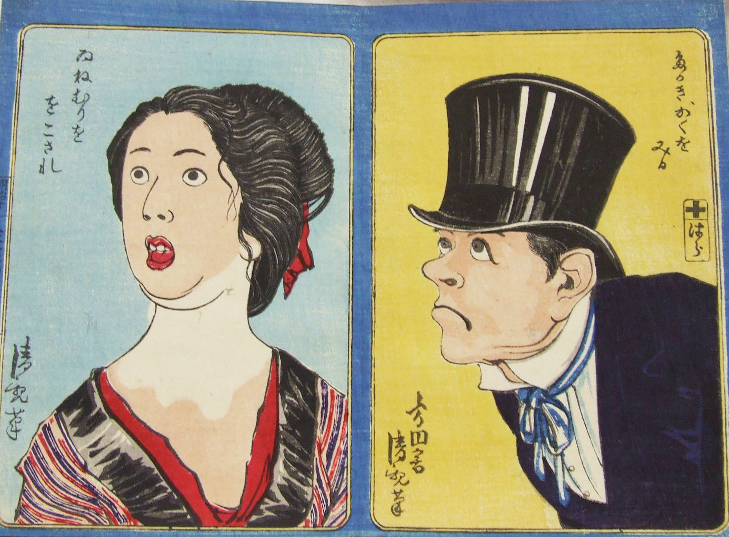Kiyochika is a very highly regarded artist of the Meiji. Described as; “…the last important ukiyo-e master and the first noteworthy print artist of modern Japan” by Richard Lane in Images from the Floating World: The Japanese Print (Oxford University Press), he illustrates very nicely the growing bonds between east and west at the time. Kiyochika broke with ukiyo-e tradition by studying under a western artist, Charles Wirgman, who was resident in Japan from 1861 until the 1890’s. Wirgman was a satirist and publisher of Japan’s first magazine, The Japan Punch. Kiyochika’s understanding of caricature and satire are visibly the influence of his English mentor. These prints picture ordinary Japanese in ordinary pursuits, some comical, others serious. The idea stems from a deep Japanese fascination with physiognomy, a popular fairground attraction, and a recent vaudeville act in which a performer imitated emotional states and social types by rapidly changing facial expressions and incidental props.